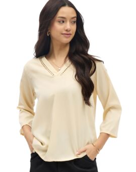 SheWill Beige Solid V-Neck Top Stylish Ethnic and Western Tops for Women Summer Travel Wear Trendy Tops for Jeans Lightweight Comfortable Casual ALLTP1267_RUS-XL