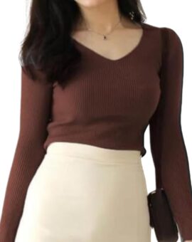 Stylish Ribbed V-Neck Full Sleeve Top for Women – Trendy Western Tops, Casual Office Wear T-Shirt Tops for Girls and Woman
