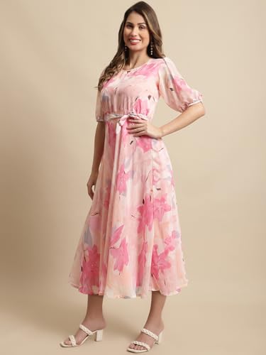 Home Product Preneum Women's Maxi Fit & Flare Latest Style Print Georgette Regular Sleeves Casual Summer Maxi Dress || Festival & Occasion, Rose Pink, M