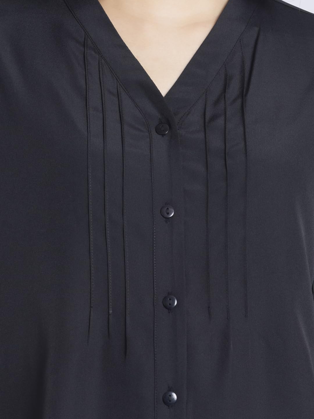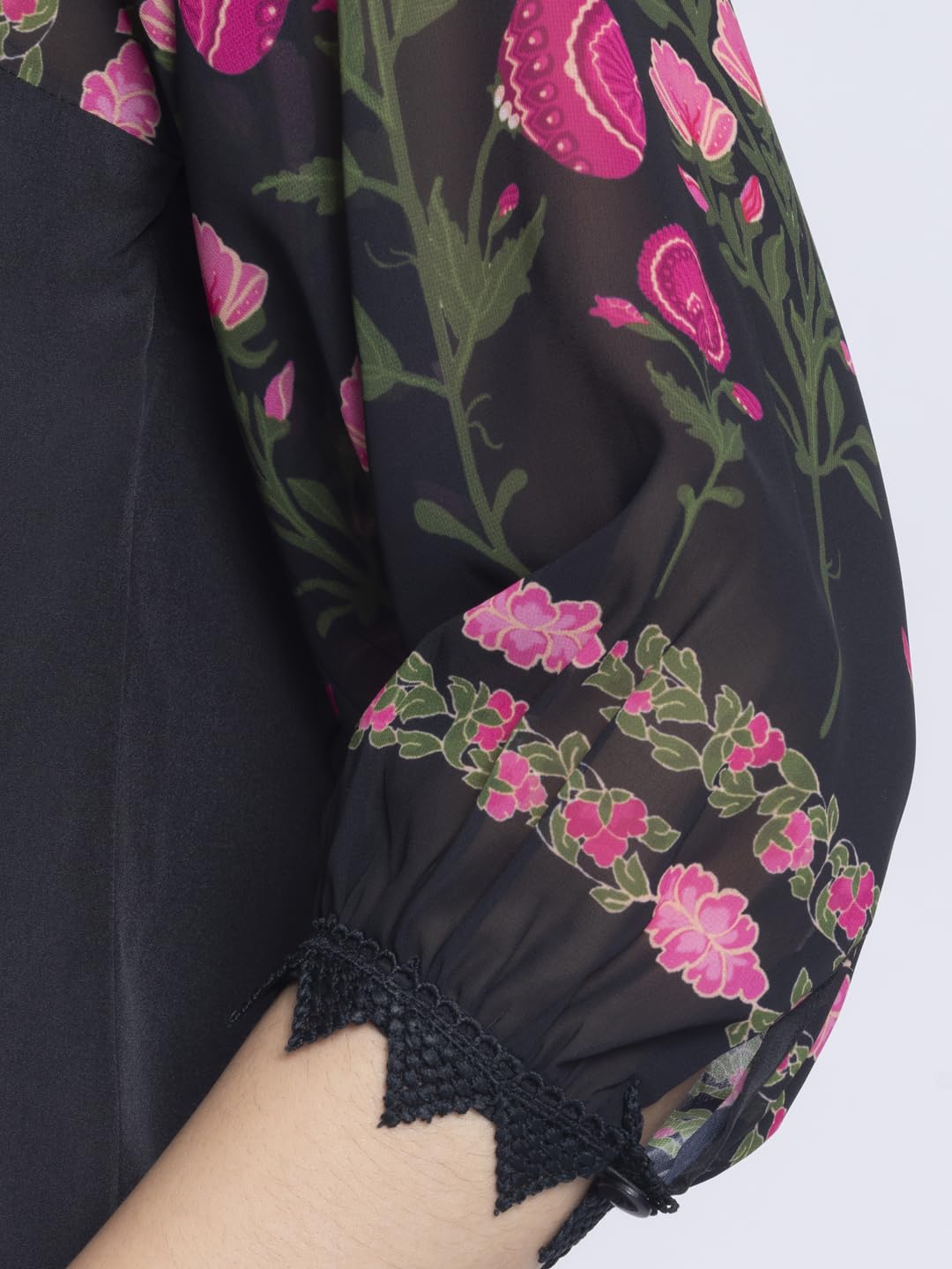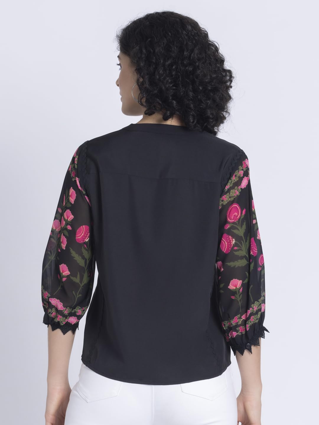 Black floral print v-neck three-quarter sleeves button down top has lace detail at front and sleeves with gathers detail at sleeves
