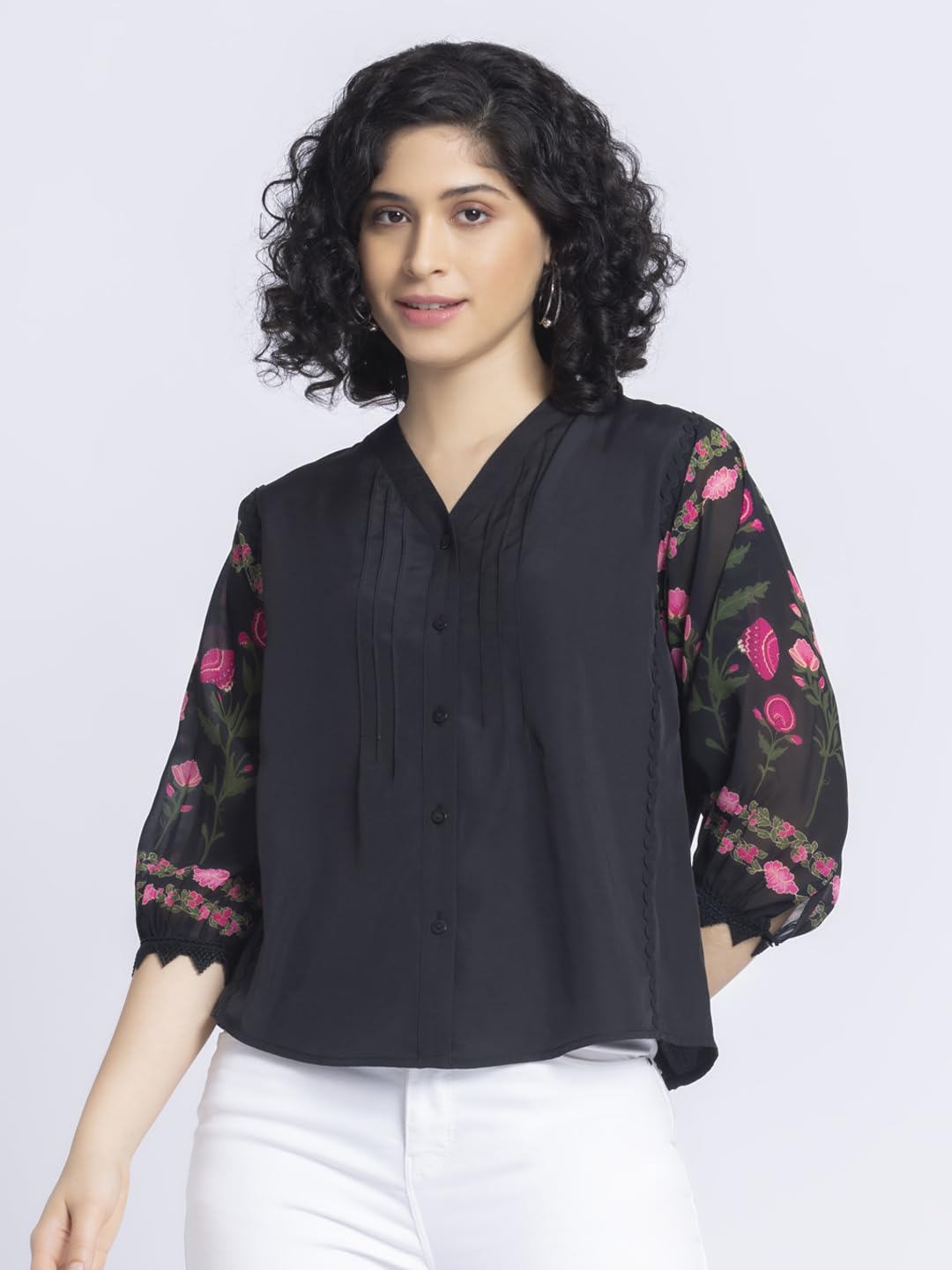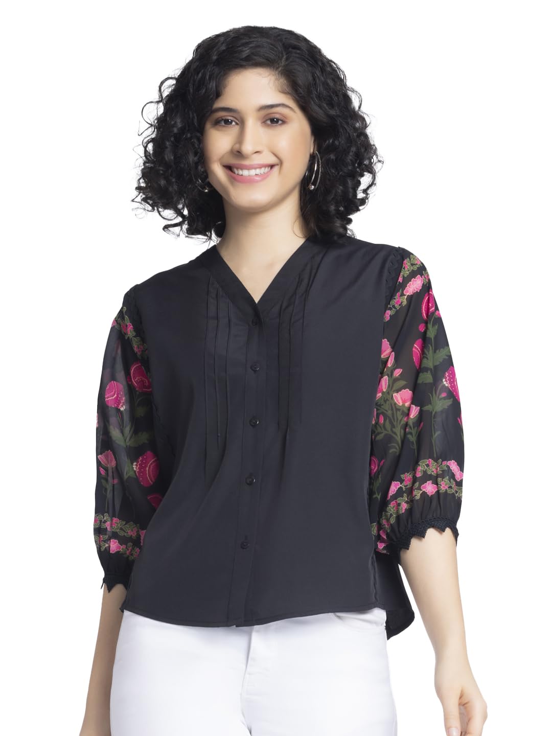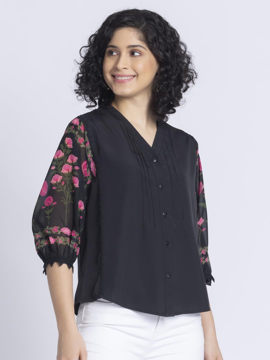 - Black floral print v-neck three-quarter sleeves button down top has lace detail at front and sleeves with gathers detail at sleeves