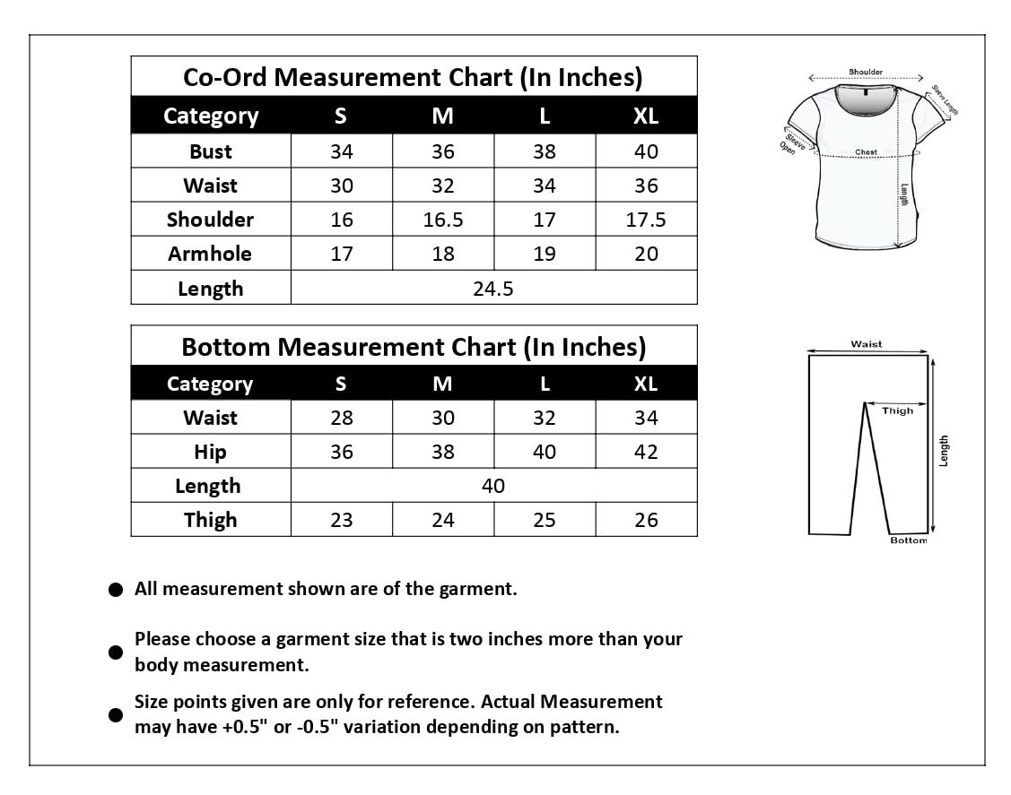 - Top length : 24.5inch || bust size : 36inch || bottom length : 40inch || bottom waist : 30inch| bottom waist type : Elastic|| Top Waist : 32inch || Shoulder : 16.5inch || Armhole : 18inch